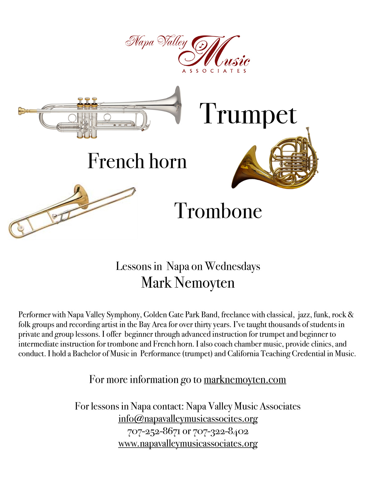 Mark teaches trumpet at beginning to advanced levels, and trombone, flugelhorn and french horn at beginning to intermediate levels. He holds a Bachelor of Music in Performance (trumpet) and California Teaching Credential in Music. He has taught thousands of students in private and group lessons. Mark resides in Novato, CA.